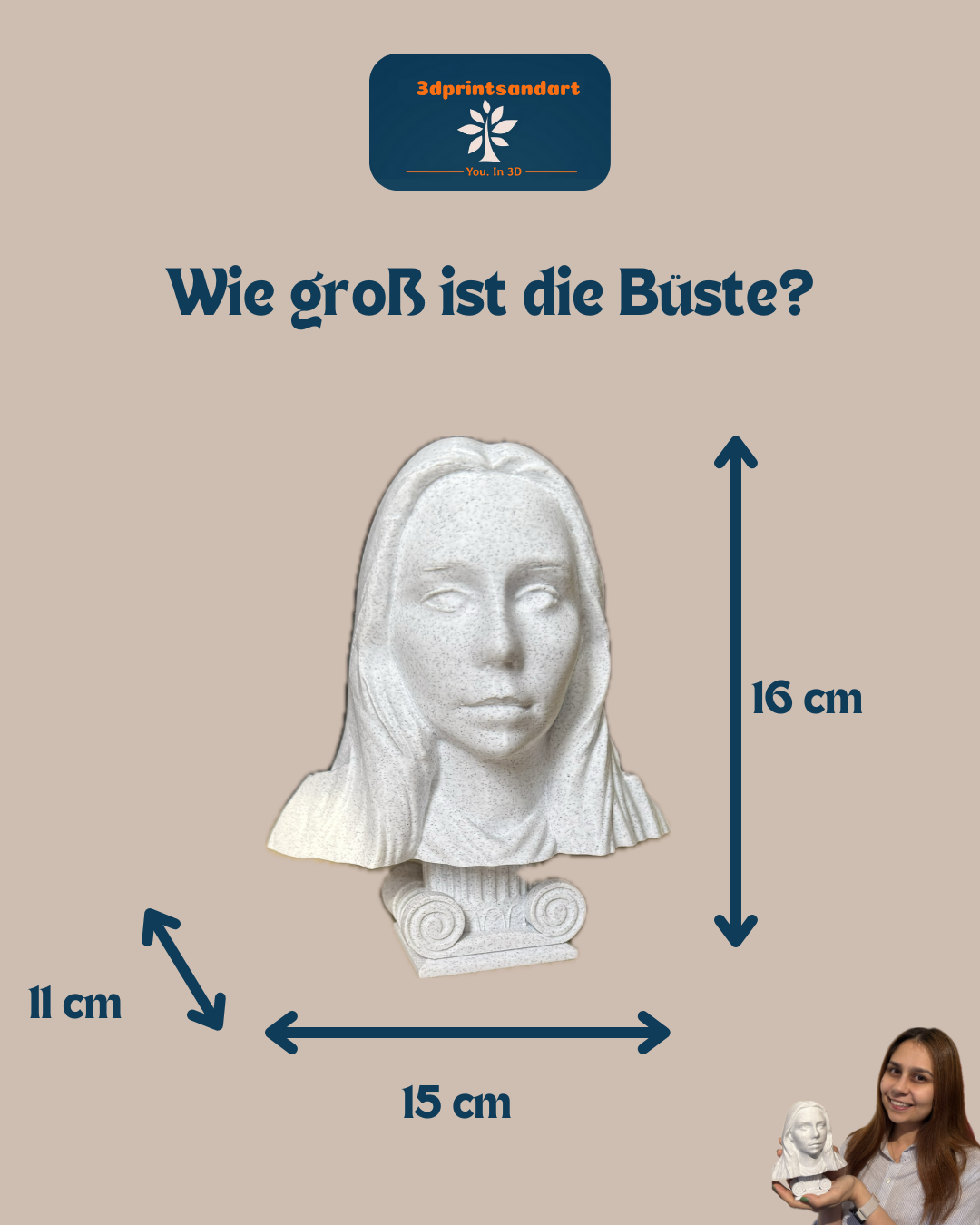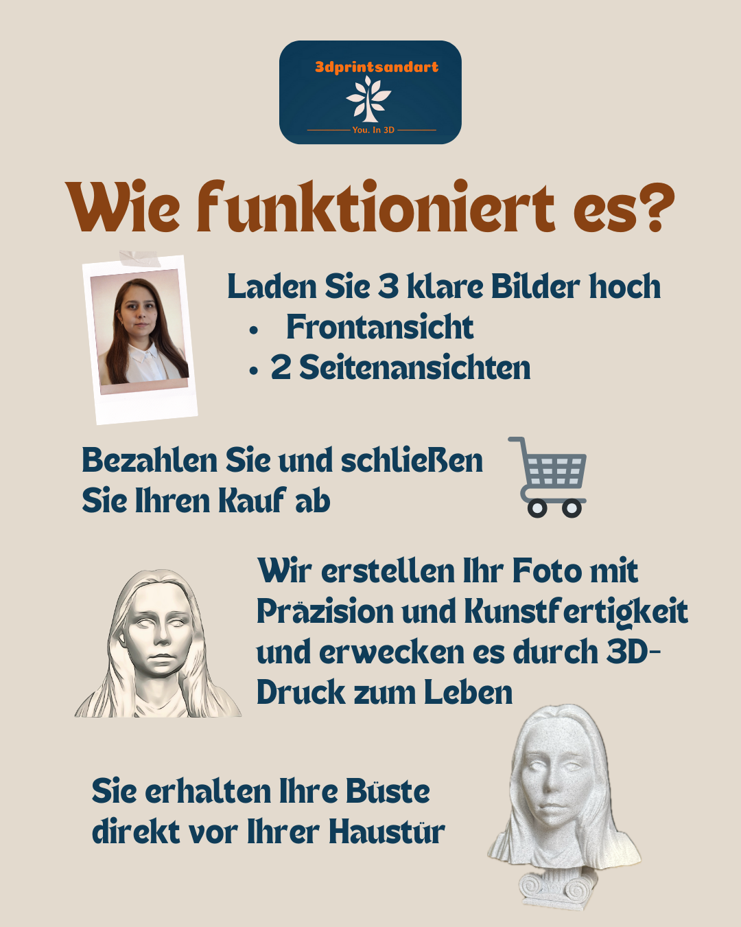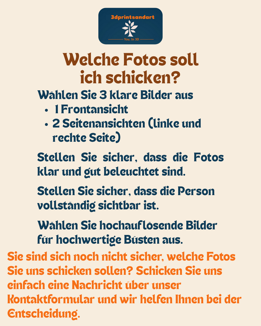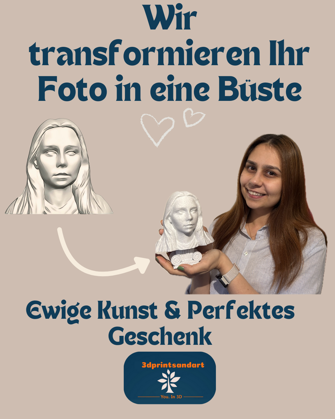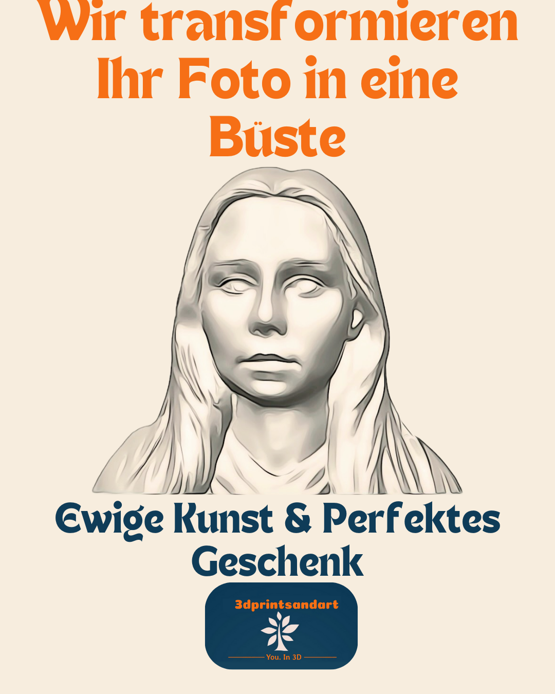 Verwandeln Sie Ihre Lieblingsfotos in eine atemberaubende, personalisierte 3D-Büsten-Skulptur. Das ist mehr als nur ein Foto, das ist 3D-Kunst zum Anfassen – ein bleibendes Andenken voller Persönlichkeit, Tiefe und Charme. Ob als Geschenk oder als Andenken – jede Skulptur wird individuell angefertigt, um die Essenz eines besonderen Menschen einzufangen.